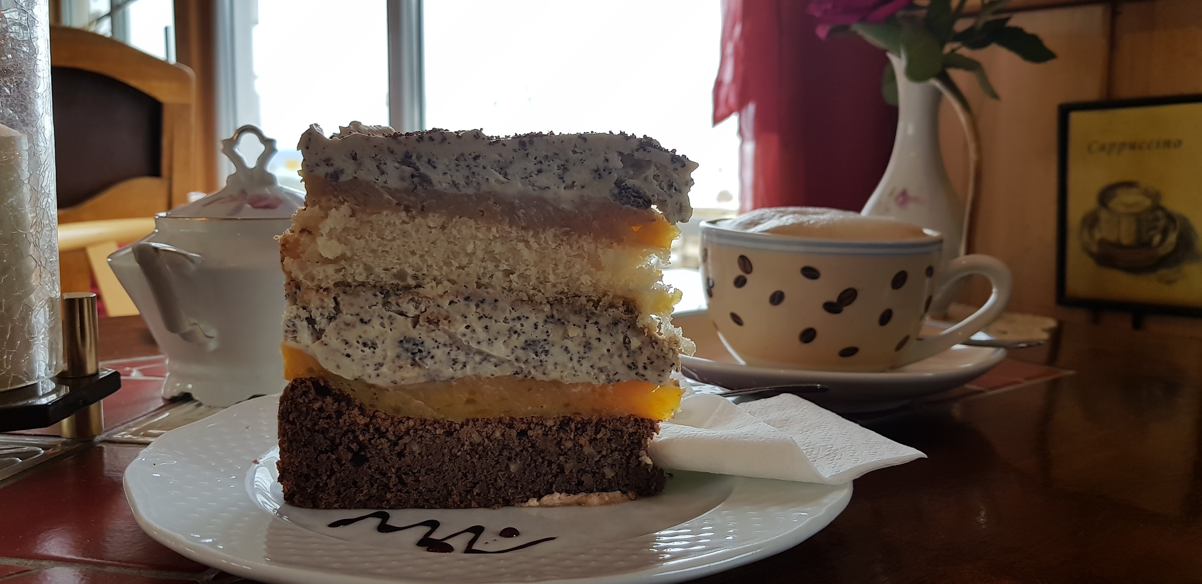 Das Moccavino in Alt Reddevitz auf Insel Rügen ist für die hausgebackenen Torten bekannt. Und tatsächlich sind diese riesig. Im Hintergrund auf dem Foto seht ihr die Sommer-wie-Winter-Torte mit sechs Schichten. Ich selbst wählte bescheidenerweise den saftig-frischen Mohnkuchen. Lecker. Besagte Torte besaß eine interessante, ungewöhnliche Geschmackszusammenstellung – nicht zu mächtig, höchstens etwas zu viel.